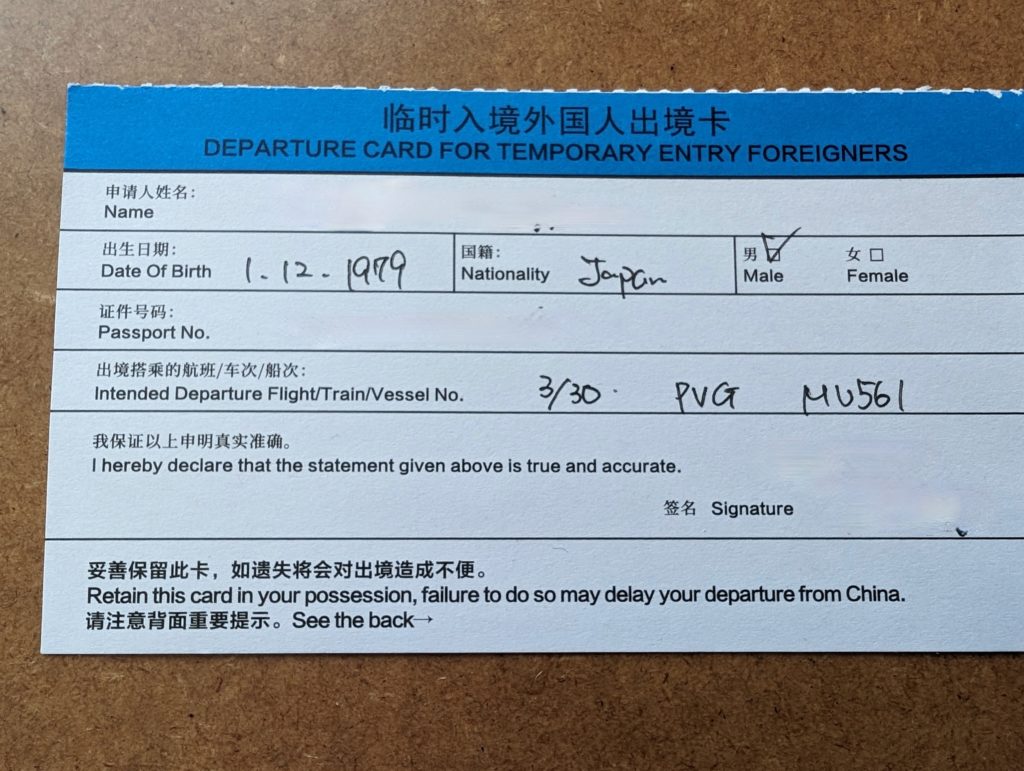 できることなら、日本出国前の航空会社のカウンターや上海へ移動する航空機内で入手できれば良いと思うのですが、セントレアや航空機内では入手できませんでした。